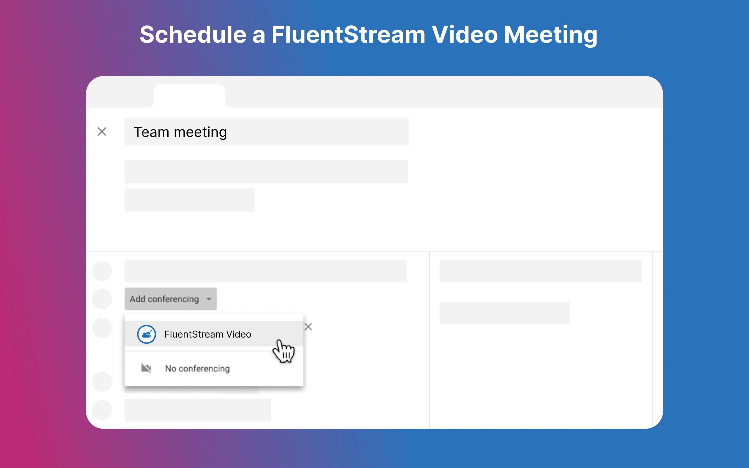 - In the calendar create a new event and in the Video conferencing field select FluentStream Video.